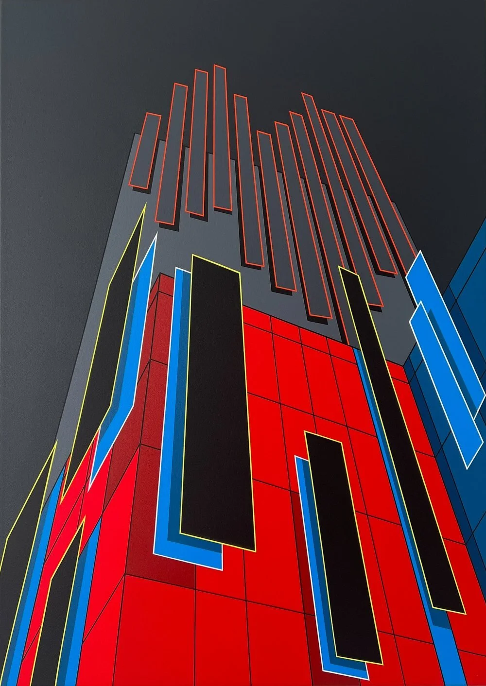 Perspective plays a central role. Sometimes I allow the perspective lines to remain visible, stretching outward and upward to emphasise the sense of infinity I want to portray. At other times, I fragment the volumes more radically, transforming familiar buildings into unexpected arrangements, both recognisable and abstract.