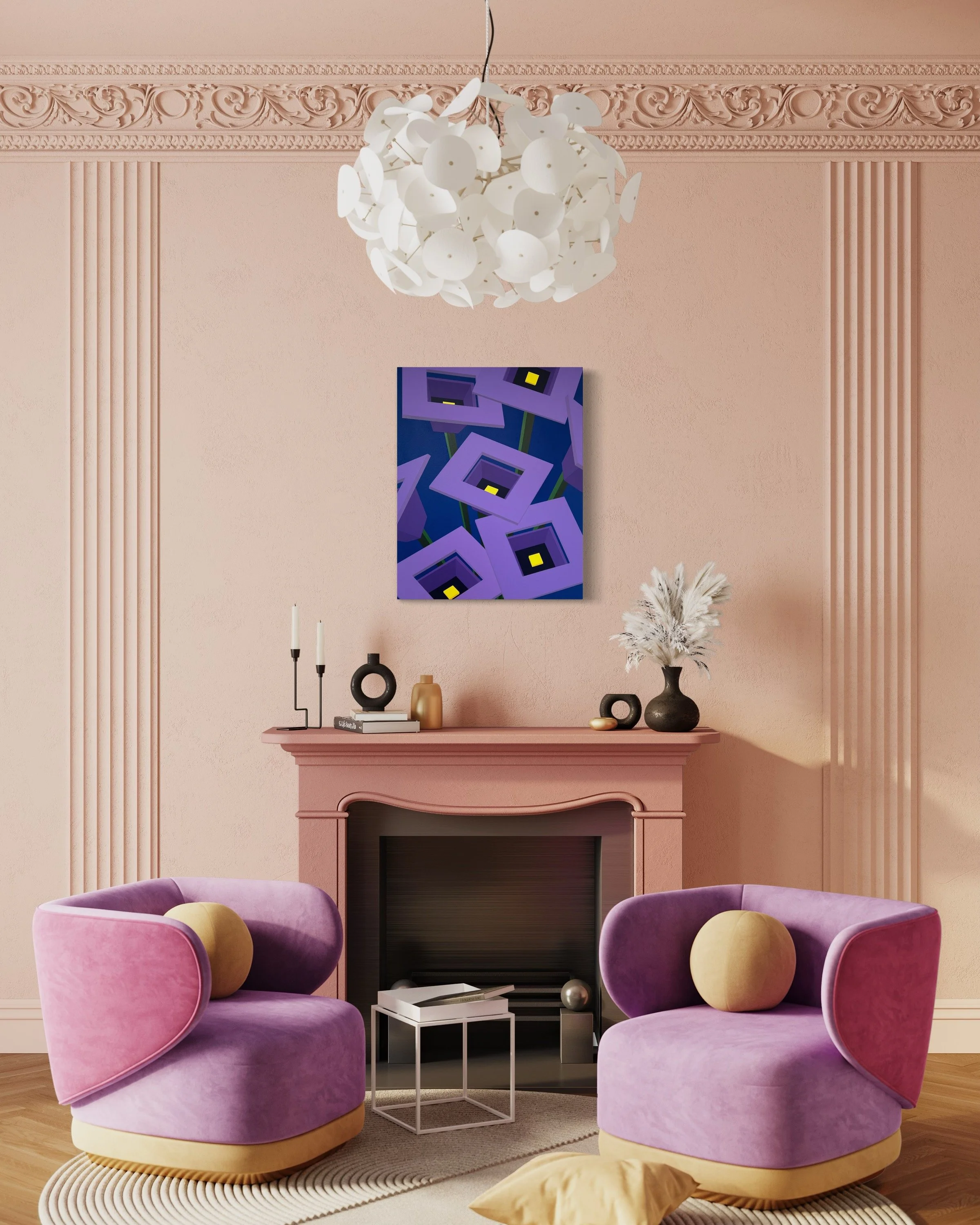 A Violets’ Fall is a downward bloom, violets leaning softly into space, each held by the familiar four-square system, yet rendered in cooler tones, on a deeper blue field. The feeling is quieter. More internal. Like a breath exhaled.