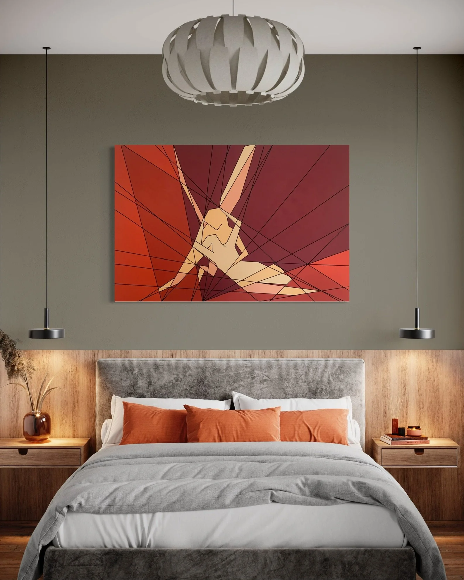 The figures emerge from the intersections of red, orange, and beige, symbolising desire, warmth, and human vulnerability. Rather than soft marble forms, the embrace here is expressed through tension and harmony between shapes, suggesting that even in abstraction, the essence of passion and intimacy remains intact.