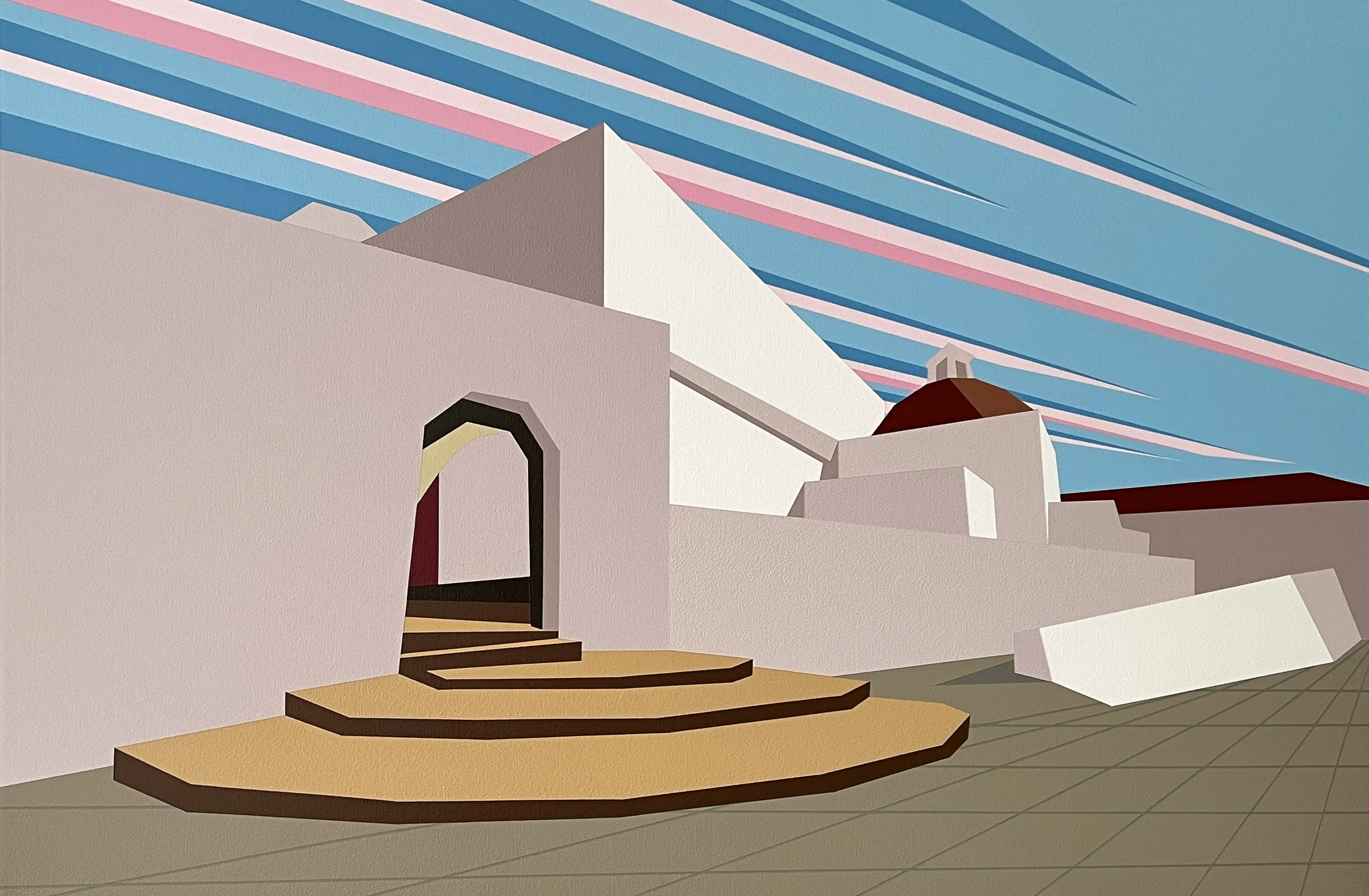 The familiar softness of Mediterranean architecture is reimagined in hard edges and vivid contrasts, while the streaked sky above adds rhythm and movement, as if time itself were drawn in colour. This is not only a portrait of a place, but of how it feels to stand before it, monumental, timeless, and alive with presence.